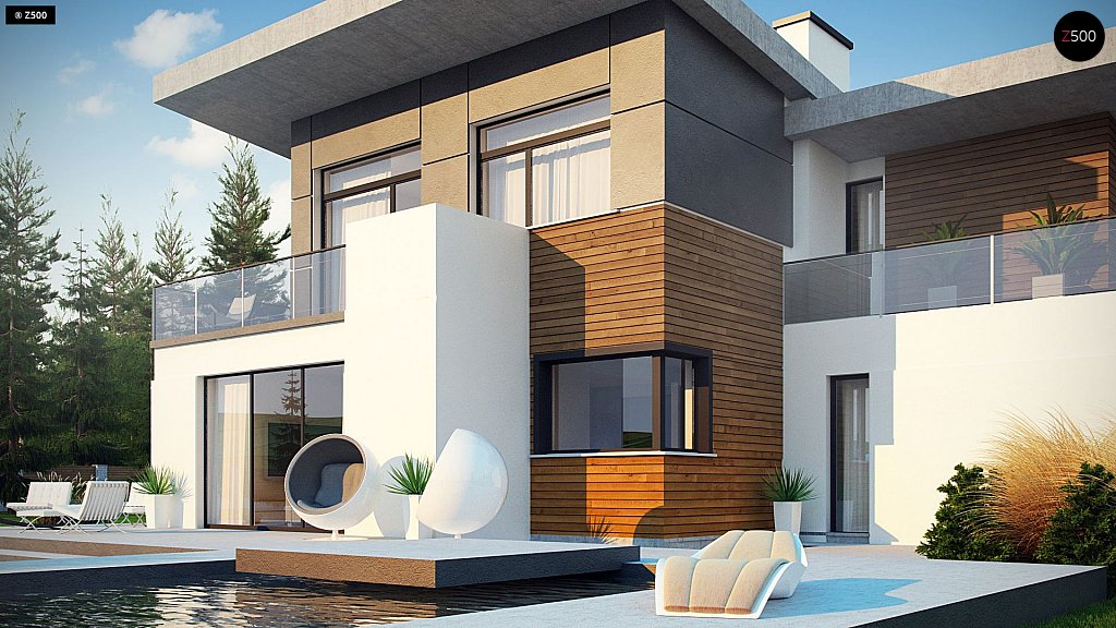 Zx182 представляет собой двухэтажный дом в современном стиле с красивыми фасадами и гаражом для двух машин. Простой и одновременно современный оригинальный дизайн фасадов позволяет выделиться дому в любой местности.